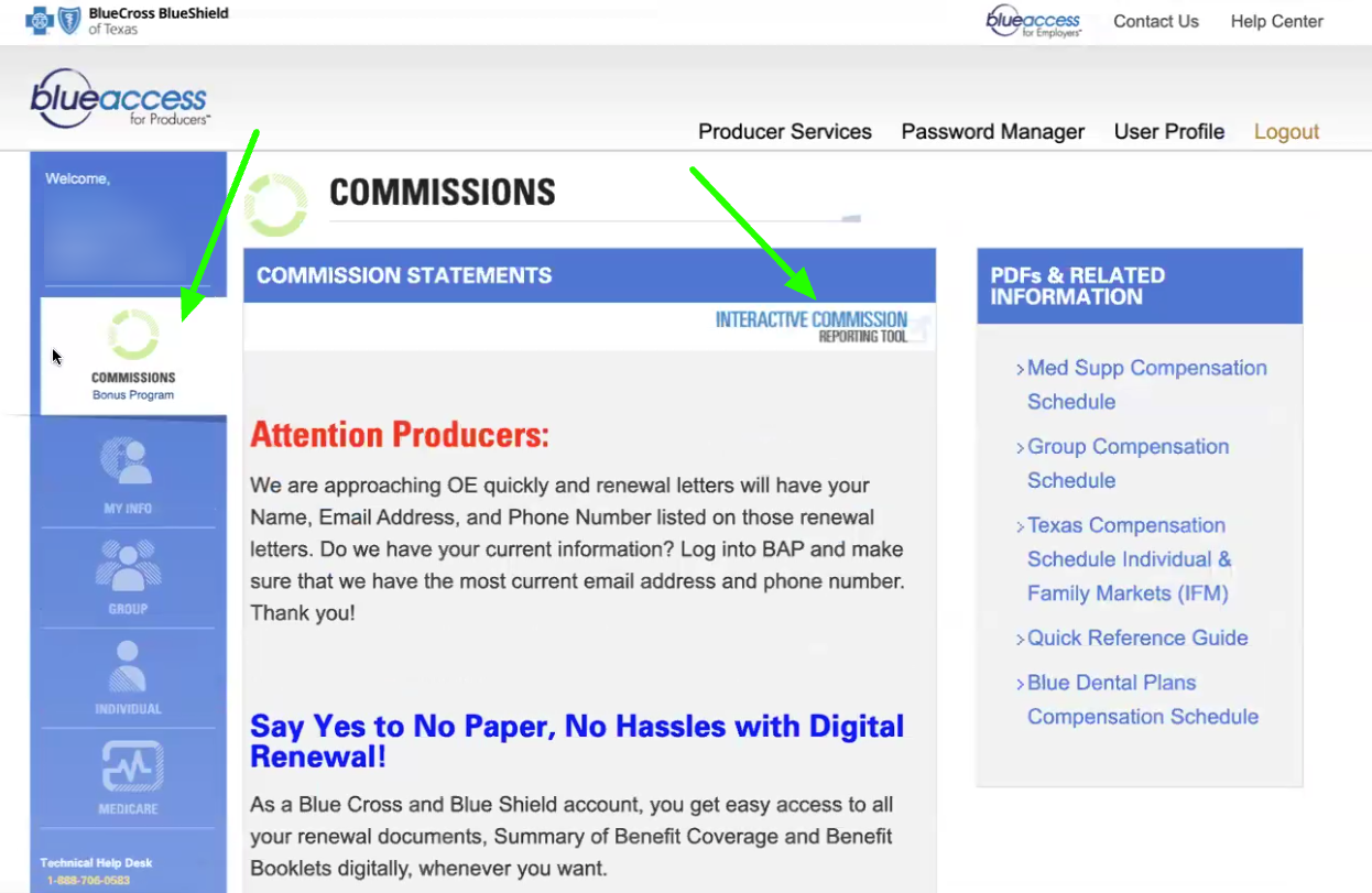 In your BCBS TX portal, select “Commissions” on the left and “Interactive Commission Reporting Tool.”